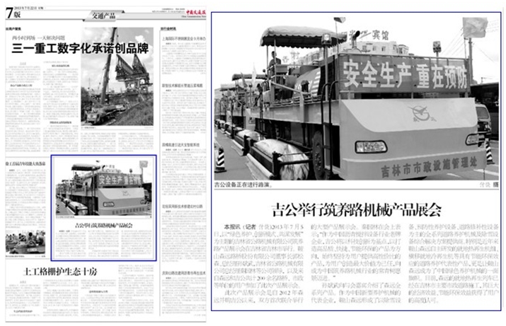 展示會得到諸多網(wǎng)絡(luò)媒體紛紛報道的同時,主流媒體平臺《中國交通報》也于2013年7月22日第七版對此次展會進(jìn)行了報道,高度肯定了森遠(yuǎn)、吉公在綠色筑養(yǎng)路行業(yè)新發(fā)展形勢下的旗幟作用,充分見證了森遠(yuǎn)、吉公以諸多代表性產(chǎn)品服務(wù)市政道路建設(shè)、贏得行業(yè)市場、獲得用戶認(rèn)可的不爭事實(shí)。