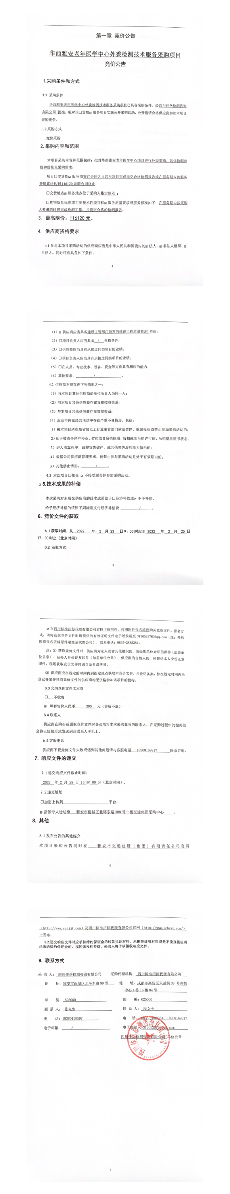 四川佳岳檢測(cè)咨詢有限公司華西雅安老年醫(yī)學(xué)中心外委檢測(cè)技術(shù)服務(wù)采購(gòu)項(xiàng)目競(jìng)價(jià)公告