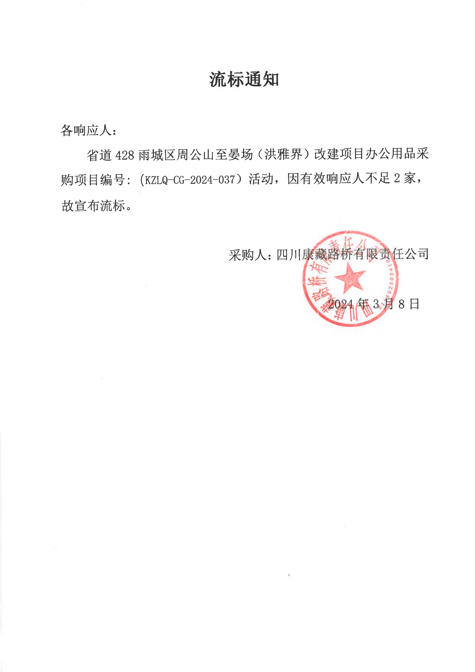四川康藏路橋有限責(zé)任公司省道428雨城區(qū)周公山至晏場(洪雅界)改建項目辦公用品采購流標(biāo)通知