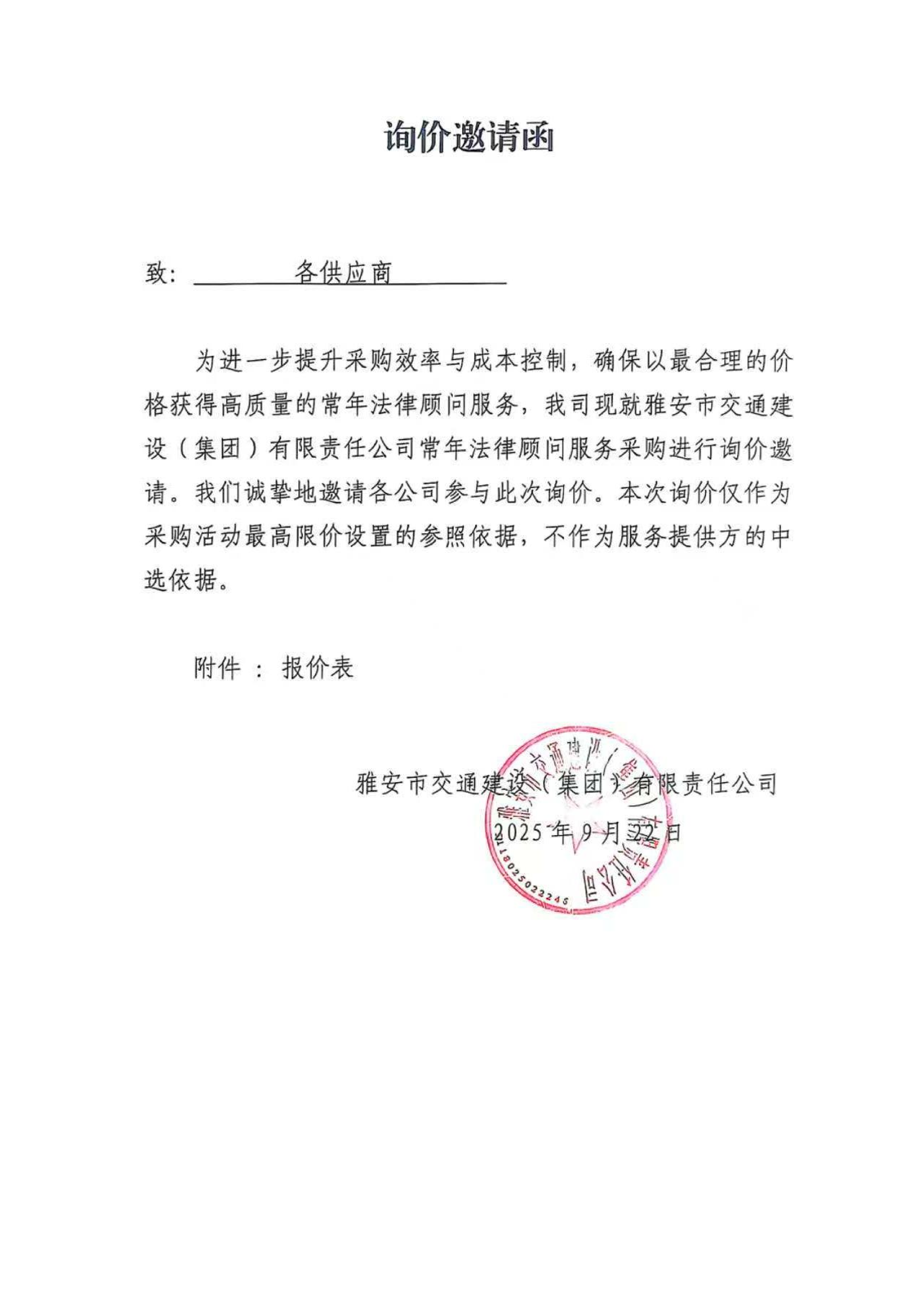 關(guān)于雅安市交通建設(shè)(集團(tuán))有限責(zé)任公司常年法律顧問(wèn)服務(wù)的詢(xún)價(jià)函